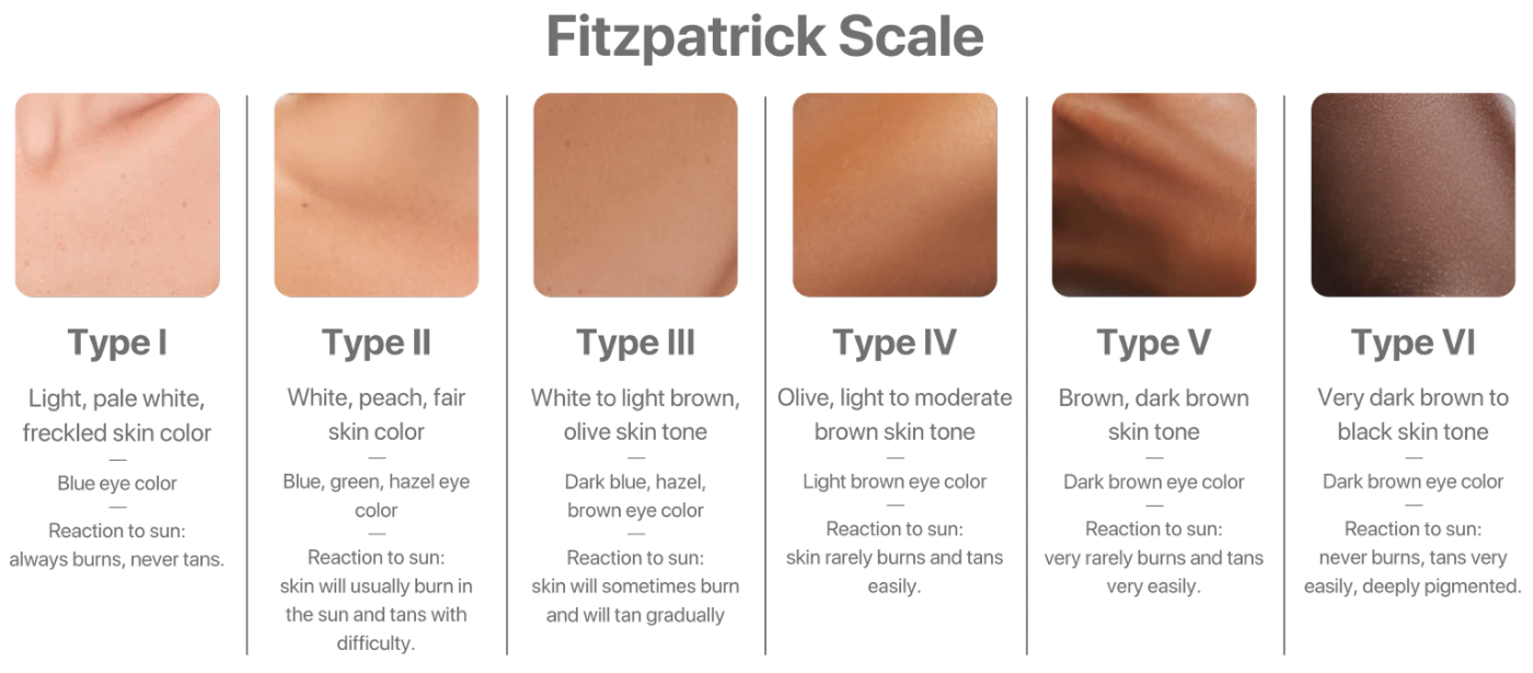 The Fitzpatrick scale classifies skin by how it responds to UV light. Because melanin absorbs heat, different skin tones require different wavelengths and energy levels to stay safe and effective.